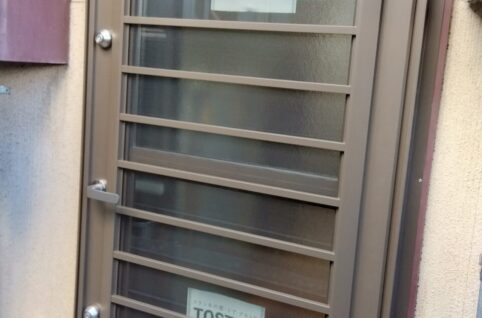 建物が古くなり、ドアと壁の間に隙間ができていました。ドアも古く防犯上も良くないとのことで、ドア交換の工事をさせていただきました。 ドアを施錠したままでも換気のできる、通風タイプのドアを取り付けさせていただきました。