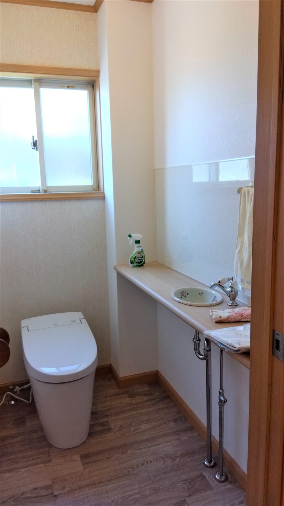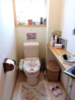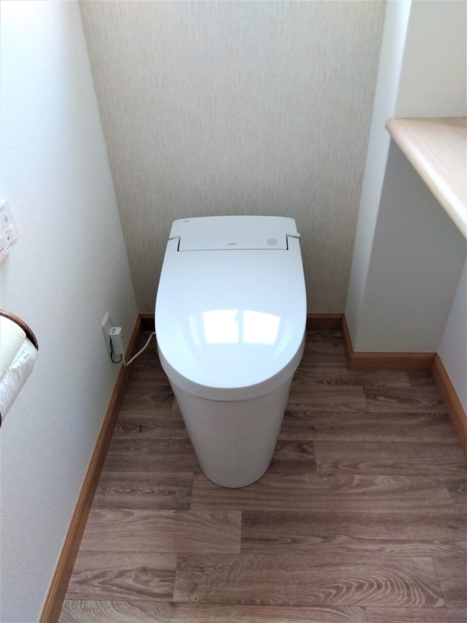 トイレ、壁紙は白を基調に、床は木目調にし清潔感のある空間にしました。